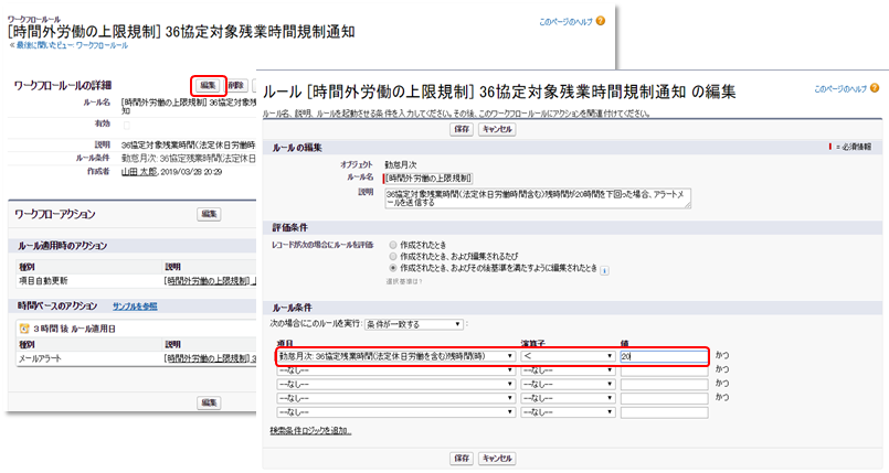 6. 36協定対象残業時間規制通知メールアラートのアクションを追加します。